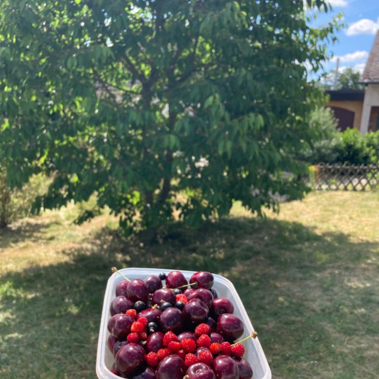 Im späten Frühling und frühen Sommer trägt der Kirschbaum reichlich süße Früchte, und an vielen Ecken wachsen kleine Walderdbeeren, an denen ihr euch gerne bedienen dürft. Im Herbst ist der Apfelbaum üppig gefüllt – wir freuen uns sehr, wenn die Äpfel gegessen und verwertet werden.