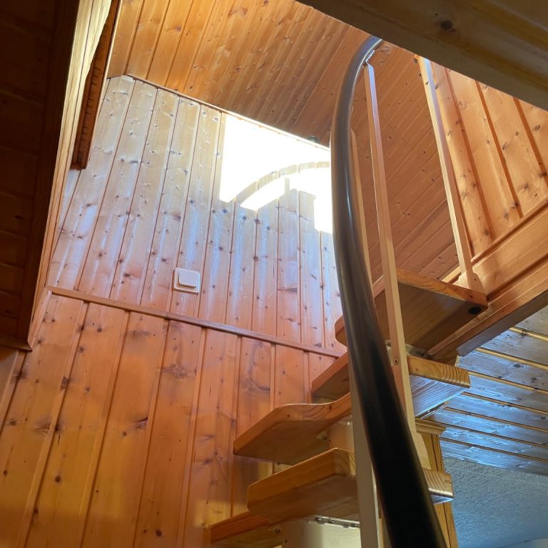 eine steile Wendeltreppe führt zum Dachboden. Wir bitten um Vorsicht, insbesondere bei kleinen Kindern!