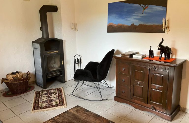 Das Wohnzimmer lädt mit seinem Kamin zu gemütlichen Stunden ein und sorgt besonders in den Wintermonaten für wohlige Wärme.