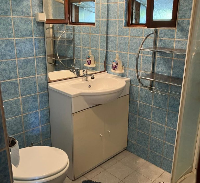 Das Bad ist im charmanten Vintage-Stil der 1970er Jahre gehalten und verfügt über eine Toilette sowie eine Dusche.
